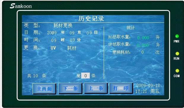 2)机箱内配置喷塑钢架,机箱表面采用ABS材质能耐酸碱、防腐蚀,5.6寸触摸屏操作界面,PLC控制操作系统,可任意设置定时、定量、定质取水,历史数据查询功能,具有中、英文操作界面及选择多国语言操作。