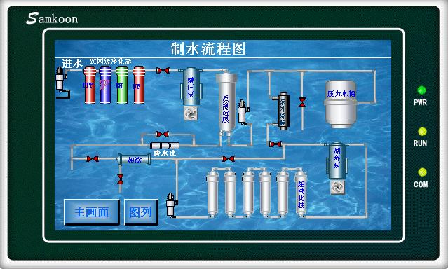 1、基于ARM7系列单片机和PLC触摸屏控制程序,人机界面的高端制水设备,并在制水过程中图形显示制水流程。